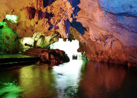 魚龍洞,與太平湖衣袂相連,距舉世聞名的黃山50公里,距佛教勝地九華山25公里,魚龍洞洞口如張開的鱷魚嘴,一泓碧水淙淙而出,終年不涸。該洞全長5000余米,有清澈的地下河貫穿始終,初極窄,復開闊,氣勢磅礴,宏偉觀,洞內奇石紛列,形態(tài)各異,或如蓮花綻放,或如玉樹臨風,或如眾僧朝圣,或如鐘鼓盤地,極為傳神,有東海、南海、北海、西海“四!埃吧徎▽m、月宮、慶喜宮、鯉魚宮、玉寢宮、白鱔宮、點將臺、犀牛宮、藏樂宮、天宮、聚寶宮”十一宮“,2014年5月新增了走路進,坐船出項目,使得游人既可徒步瀏覽,又可乘木舟漫游,奇妙的景色與水聲、波光、燈影交織成一團,撲朔迷離,意趣橫生。