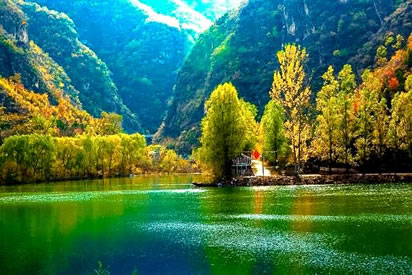 北京延慶烏龍峽谷景區(qū)——原名黑龍?zhí)。位于黑河的下游,屬距?.4億年前的中生代火山熔巖區(qū),全長(zhǎng)2公里,是典型的山間河流深切河谷地貌景觀,峽谷兩側(cè)絕壁陡直、怪石林立,水聲轟鳴,浪花飛濺,以青山幽谷、碧水深潭遠(yuǎn)近聞名。這里,懸崖陡壁,潭澗相連,依次為四潭、三潭、二潭、頭潭;其中,頭潭較闊,四潭最深。每年豐水時(shí)節(jié),峽谷內(nèi)奔涌的河水從幾十米高的懸崖上飛瀉而下,激蕩于山澗巨石之間,但見浪濤擊石,銀花飛濺,雷鳴般的濤聲如群獅怒吼,煞是壯觀。