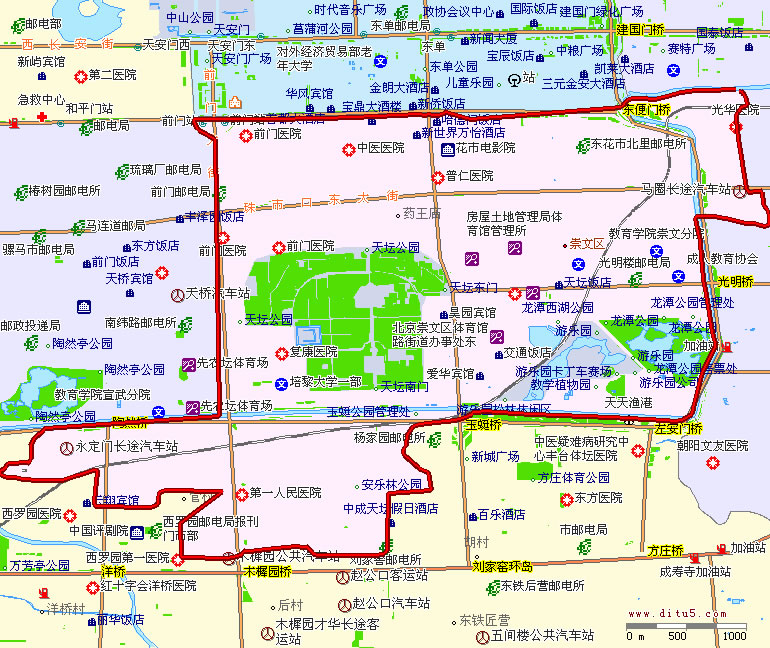 崇文區(qū)轄7個(gè)街道:前門(mén)街道、崇文門(mén)外街道、東花市街道、龍?zhí)督值馈Ⅲw育館路街道、天壇街道、永定門(mén)外街道。