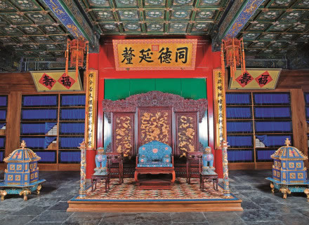 “多福軒”此匾為咸豐皇帝所題。意為幸福很多的殿堂。殿內(nèi)正中懸掛“同德延禧”匾額,意在告誡主人:你與皇帝同德才能延禧(禧:吉祥如意、福壽綿長(zhǎng))。殿內(nèi)四壁靠近天花板的地方皆懸掛福壽字匾,這些福壽字均寫于紅色方紙之上(即“斗方”)呈梭形擺放,一福一壽成對(duì)制成匾額。