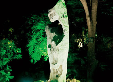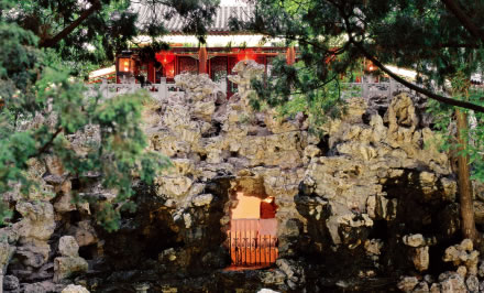 安善堂”北有一座假山,名叫滴翠巖。藏有康熙福字碑的秘云洞,就位于“滴翠巖”中心腹部。假山頂是整個(gè)花園的制高點(diǎn),頂上的建筑叫“綠天小隱”;建筑前面的平臺(tái)為“邀月臺(tái)”,是賞月的地方。