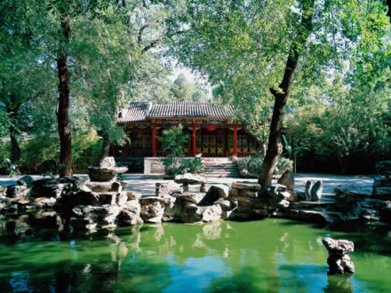 西路的方塘,面積約有2000平方米,是王府花園里最大的水域。有亭翼然立于湖心之中,雕梁畫棟,滿繪彩畫,船型的木橋與岸邊相接。粉色的荷花亭亭玉立,與大如華蓋的翠綠的荷葉交相輝映。戲水的白鵝,時(shí)時(shí)躍出水面的金魚,打破了水面的平靜。此情此景,令人恍若置身于仙境之中。