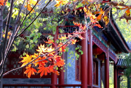 中路的蝠池,形似蝙蝠,汪汪一碧。春天到來(lái)的時(shí)候,池子周邊的榆樹結(jié)滿成串的“榆錢”,紛紛落入水中。這蝙蝠的“蝠”和榆樹的“榆”合起來(lái),就是“富裕”的諧音!皥D必有意,意必吉祥”在造園中得到了靈活充分的運(yùn)用。