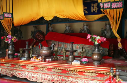 俗稱臥佛寺,位于海淀區(qū)香山壽安山南,始建于唐,清雍正十二年(1734年)大修后賜名“十方普覺寺”。全寺規(guī)模宏大,總體布局和建筑配置一定程度上保留了唐宋寺院的特點。臥佛殿內(nèi)的銅質(zhì)臥佛為元代遺存,長5.3米,高1.6米,重4噸,頭朝西面,面向南,鑄造精良,是中國現(xiàn)存最大的銅質(zhì)臥佛,具有較高價值,也是科技史研究的重要實物資料。