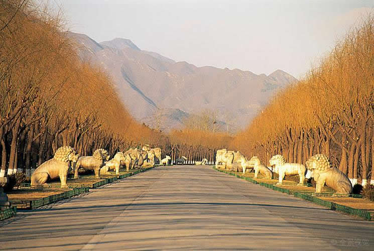 欞星門又叫龍風門。由四根石柱構(gòu)成三個門洞,門柱類似華表,柱上有云板、異獸。在三個門額枋上的中央部分,還分別飾有一顆石雕火珠,因而該門又稱“火焰牌坊”。龍鳳門西北側(cè),原建有行宮,是帝后祭陵時的歇息之處。,但后來便成了全陵區(qū)的主陵道了。該道縱貫陵園南北,全長7公里,沿線設(shè)有一系列建筑物,錯落有致,蔚為壯觀。
