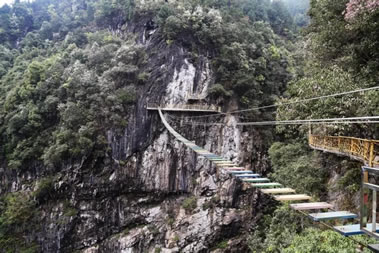 青龍橋位于景區(qū)接待中心服務(wù)區(qū)內(nèi),通過檢票口步行5分鐘可以到達(dá),是景區(qū)戶外項目,由長80米、寬0.8米的鋼絲木板橋和長30米、寬1.5米的玻璃棧道組成,高200米,站在青龍橋可俯視整個峽谷,可體驗走鋼絲的感覺,驚險刺激。