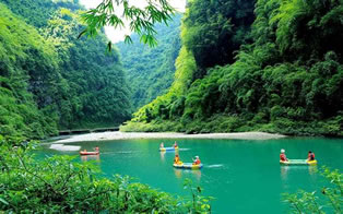 青龍谷位于彭水縣城西南18千米阿依河畔,峽谷高300米,長1600米,蜿蜒幽曲如巨大的青龍。谷口塑有兩條青龍,叫作“雙龍迎客”,一是巖壁浮雕,龍身擺舞,龍爪張揚;一是盤龍騰空座雕。谷岸兩山逶迤交織,谷澗溪河蜿蜒穿洞,是典型的峽江峽谷風(fēng)光。谷內(nèi)兩岸翠竹連綿,綠樹成蔭。峽谷內(nèi)有一線天、黑洞等景觀。