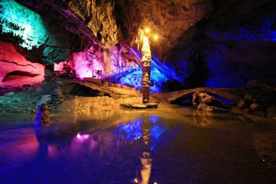 青龍洞位于牛角寨下行3.3千米處,溶洞環(huán)線總長1590米,有上下兩個支洞,洞內(nèi)溫度宜人,常年恒溫16攝氏度。青龍洞是石灰?guī)r地區(qū)被地下水幾十萬年長期溶蝕而形成,洞內(nèi)沉積物極其豐富,鐘乳石、石花、石筍、石幔、石旗、邊石壩等分布密集。沿途有漢白玉觀音像、九子龍門、龍池、龍女彩帳、龍王戲水、擎天玉柱、步步生蓮等景點與玻璃棧道、激光燈光融合的特色夢幻溶洞景觀。在溶洞盡頭有一幕兩百多米高的銀白瀑布,名洞天飛瀑,瀑布四壁呈圓錐形,指向高高的穹頂,聲如雷鳴,雄偉壯觀。