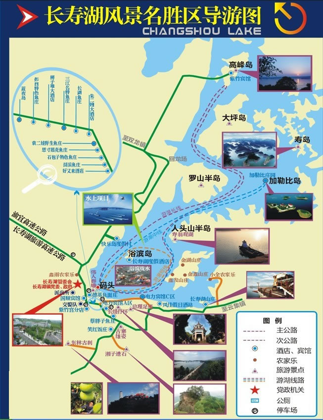 長(zhǎng)壽湖是西南地區(qū)最大的人工湖,因1954年修建中國(guó)第一座自行設(shè)計(jì)、施工建設(shè)的大型水電工程獅子灘水力發(fā)電站形成湖泊。以長(zhǎng)壽湖為核心,總面積266.73平方千米,其中湖面面積65.5平方千米,共有大小島嶼203個(gè),是三峽國(guó)際旅游黃金線的重要節(jié)點(diǎn)。最奇特的景觀是在湖心區(qū)域有一處由19個(gè)島嶼、半島圍合形成的長(zhǎng)1299米、寬699米、占地33公頃的“天賜壽島”,其形狀似魏碑體的“壽”字。整個(gè)景區(qū)以其“島湖風(fēng)光”“長(zhǎng)壽文化”享譽(yù)四方,并以“長(zhǎng)湖浪嶼”被評(píng)為巴渝新十二景之一。