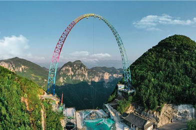 飛拉達是意大利文,是巖壁探險或鐵道式攀登的音譯,指在山體巖壁上建設由鋼扶手、腳踏、生命鋼纜等構成的攀登徑道。龍缸景區(qū)飛拉達位于標識性景點云端廊橋左側,距石筍河垂直高度700余米,攀登徑道全長600余米,主要由彩虹橋、鋼索、長空棧道、十二生肖秋千橋、空中圖騰柱、攀爬梯道組成,其中彩虹橋全長62米,因橋面板上繪制有不同色彩和風景而得名。鋼索橋長約41米,由一根走繩、兩根扶繩組成,走繩非常細小,刺激驚險。整個項目的錨固方式為采用化學錨栓錨固技術將鋼錨植入巖石1米多深,每一條鋼索的承重達到2噸左右。