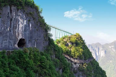 絕壁棧道位于龍缸景區(qū)映月洞至奓口石的游步道中,在數(shù)百米的懸崖上建設長約3320米的空中絕壁棧道,其中200米為全透明玻璃棧道。棧道分為牽手棧道和月影棧道兩個部分,徒步其間,一側是千尺奇峰,一側是深谷澗壑,仿佛驚險地行走在天地之間。