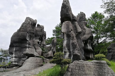 在香爐山背面,有一塊面積逾一平方公里的石頭城。仔細(xì)一看,這些石頭都象一座一座塔,參差不一,層數(shù)不一,最高的有八層,高二十余米;最起碼也有兩層,與人高低相近。他們形狀與人工堆砌的塔極相似,有基座,有沿有頂。近百座這樣的塔擁擠在一起,人穿行其間,迷離難尋歸途。因其數(shù)量多,便被游人譽(yù)為“千塔城”。