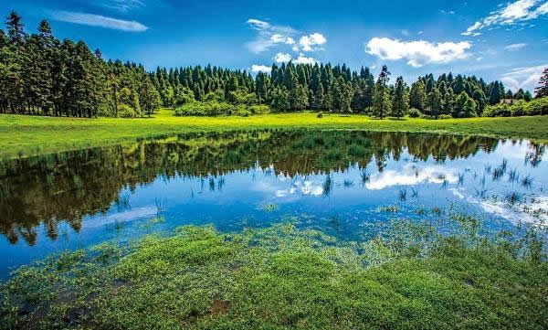 水池四周被險(xiǎn)峻的山峰、茂密的森林以及茂密的草叢嚴(yán)嚴(yán)籠罩,池水澄碧如玉漿瓊液般圣潔。無(wú)風(fēng)時(shí),波浪不興,靜若處子,倒映著藍(lán)天白云、花草樹(shù)木,偶爾有一兩只橫斜水面的飛鳥(niǎo),宛然一幅水墨淡雅的山水畫(huà)。一屢清水如遇微風(fēng)徐來(lái),池面便被揉皺,泛起層層漣漪,粼粼波光,就像下凡的仙女顧盼生情的一雙美目。加上有林濤鳥(niǎo)鳴、夏蟬秋蟲(chóng)的熱鬧,使仙女池顯得靜寂幽深,親臨此境,如同走進(jìn)幻妙的撣境一般。