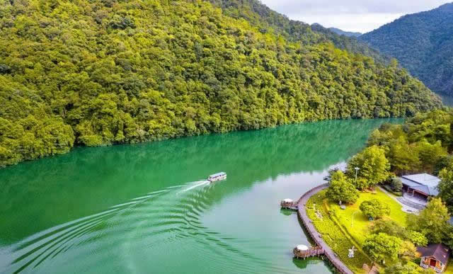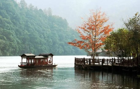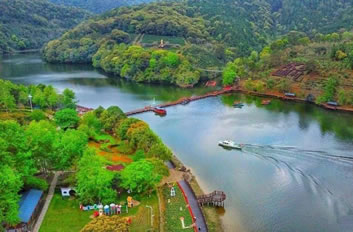景區(qū)中的水域長達七公里,清澈的水流,色彩斑斕的山林倒影,構(gòu)成生機勃勃的山水畫卷,使人有“舟行碧波上,人在畫中游”的親切感受。這里是各種野生動植物的聚集地,有各種奇花異草和珍禽走獸。每年年底到次年的初夏,總有一大群鴛鴦飛臨此地,在這水質(zhì)清純、環(huán)境優(yōu)美的地方過冬,為景區(qū)增添了愛的溫馨,傳播愛的信息。