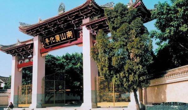 南山廣化寺:座落在城南鳳凰山。現(xiàn)行建筑群是清光緒初年依舊制重修的,從20世紀(jì)80年代開始,進(jìn)行了大規(guī)模的擴(kuò)建。山門照壁上有中國佛教會(huì)已故會(huì)長(zhǎng)趙樸初題寫的“莊嚴(yán)國土,利樂有情”。廣化寺占地3.2萬多平方米,建筑物面積1.7萬平方米。踏入山門,沿著中軸線建筑拾級(jí)而上,全長(zhǎng)385米。依次是照壁、牌坊、山門、放生池、彌勒殿(天王殿)、大雄寶殿、法堂(上為藏經(jīng)閣)、臥佛殿(下為祖堂);兩側(cè)翼建有寬敞的石柱廊廡,東側(cè)次第為東羅漢殿、鐘樓、五觀堂、伽藍(lán)殿、尊客堂、水云鄉(xiāng)、圓通門、溪聲閣;西側(cè)次第為西羅漢殿、鼓樓、學(xué)戒堂、祖師殿、凈行堂(念佛堂)、煙霞窟、方丈室、看山樓。寺后東西兩角的最高處,分別聳立著觀音閣和小南山。南山上有幾十株不知年代的蒼松翠柏。