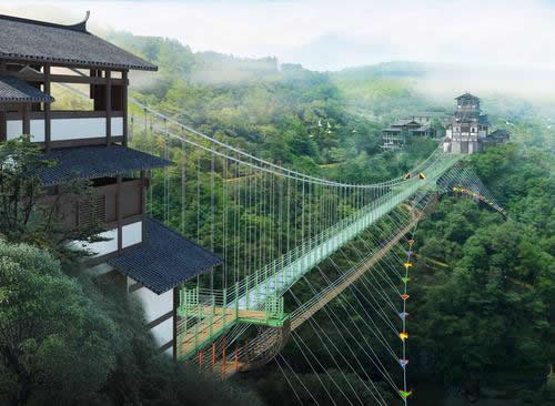 離地200米,全長300米,上層是(全透明玻璃無豎杠+10D全息特效)構(gòu)造橋面,除了比普通玻璃天橋恐怖10000倍,“深海巨鯊、彎彎曲曲的羊腸小道”等3D特效與“走一步碎一片玻璃”的全息碎裂效果令人提心吊膽;下層是步步驚心高空極限挑戰(zhàn)項目。