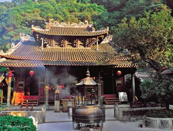 梅州靈光寺布局奇巧,主殿以"菠蘿頂"建筑為最大特點(diǎn),乃全國罕見,堪稱廟堂建筑藝術(shù)的杰作。這個最大的佛殿(又名“菠蘿殿”),重檐歇山頂,面闊三間,寺內(nèi)香火盛時,殿內(nèi)仍不留一絲煙縷,殿頂亦片葉不留,可能與菠蘿頂有關(guān),這是建筑科學(xué)史上的一大杰作。