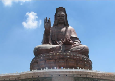 云海蓮臺(tái)地處西樵山風(fēng)景名勝區(qū)中心地帶,是以觀音文化為主題的大型景區(qū)。主要建筑有觀音法相、牌坊、影壁、放生池和浮雕等。觀音法相高達(dá)61.9米,是世界上最高的觀音造像。游客從北向入口,迎面聳立著一座六柱五門天柱牌坊,牌坊后隔著一個(gè)廣場(chǎng),建有影壁,用優(yōu)質(zhì)花崗巖雕筑,左右各設(shè)山門,壁后刻有觀音六字真言,漢文由九華山住持、安徽省佛教協(xié)會(huì)會(huì)長仁德手書,藏文由西藏活佛親筆題寫。影壁上還刻有韋陀法像。影壁后為一放生池,池旁圍以蓮花作雕的白石欄桿,跨過放生池上的石拱橋,沿著283級(jí)開闊而整齊的石臺(tái)階,便可達(dá)觀音法像的蓮花座下。