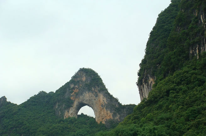 月亮山位于位于廣西壯族自治區(qū)桂林市陽(yáng)朔縣十里畫(huà)廊景區(qū)末端。山頭上有一個(gè)天然的大石拱,兩面貫通,遠(yuǎn)看酷似天上明月高掛。從不同的角度變換觀(guān)看,此洞形狀也不斷變化。如果是開(kāi)著車(chē)賞月山,那個(gè)石拱的形狀會(huì)從彎彎的上弦月,逐漸變成半月、圓月,繼而又變成下弦月。