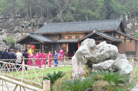 “如今廣西成歌海,都是三姐親口傳”。劉三姐是傳說(shuō)中的壯族歌仙,她以山歌為武器,與土豪莫懷仁進(jìn)行了針鋒相對(duì)的斗爭(zhēng)。景區(qū)內(nèi)的豪宅就是莫懷仁居住的莫府。莫府坐北朝南,東青龍,左傍蒼翠秀美的西山;西白虎,右依靈氣生生的踩月山;南朱雀,前環(huán)美麗的桃花江;北玄武,背靠徐霞客記載過(guò)的獅子峰。