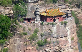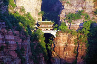 一絕“橋樓殿”。橋凌駕于百仞峭壁之間,仰視藍天一線,俯首萬丈深淵。形制如同趙州橋敞肩拱式。橋上建樓,云飛樓動,樓內(nèi)建殿,殿內(nèi)三尊大佛。真是“千丈虹橋望入微,天光云彩共樓飛”,不是仙境勝似仙境,疑是天堂落塵!,F(xiàn)為中國三大懸空寺之一。