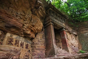 登上云梯頂端,有靈官殿當面而立。其后,兩崖嵌一略呈圓形的巨大黑石,懸于殿頂上方。每逢山洪成瀑,飛流直下,一臨此石即蹤跡不見。靈官殿建于此石之前,正當洪口,竟安然無虞。這一奇怪現(xiàn)象,極似黑石有特異功能,因而昔人視之為山靈,稱它是“避水珠”,以至“山靈有意夸騷客,多少名流為賦詩”!其實,填塞崖澗修筑天梯時,巧匠有意留下了一條暗道,以便泄洪。黑石正好嵌于兩崖最窄處,同靈官殿一起遮住了暗道。飛瀑即從石后的暗延宣泄而下,故而黑石有“避水靈通”。由于游人所處的位置看不到石匠暗隧,才難解這一奇異的現(xiàn)象。飛流直下的壯觀,攸而不見的玄妙融合一體,構成峭壁嵌珠之景,在此的確獨具特色。靈官殿東南有傳說中的水簾洞,是崖隙中溢出的山泉。