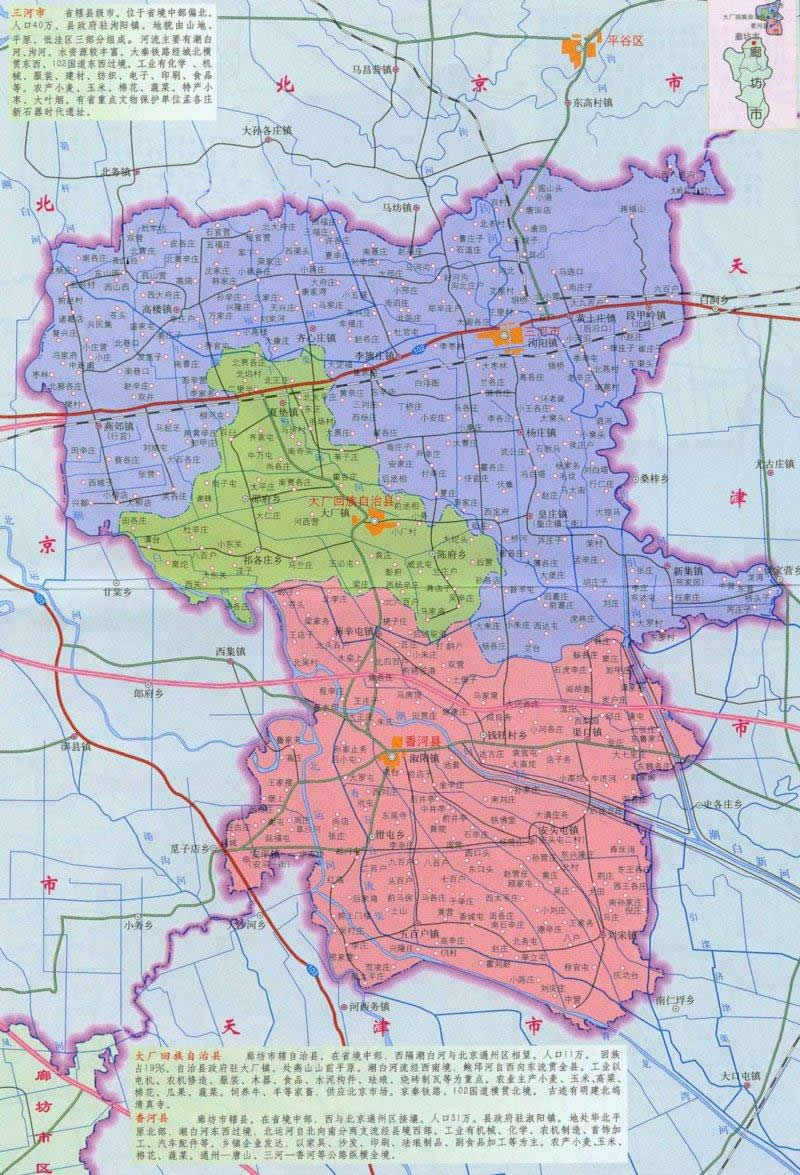 1993年經(jīng)國務(wù)院批準(zhǔn)撤縣設(shè)市,現(xiàn)轄10鎮(zhèn)2區(qū)(燕郊省級經(jīng)濟(jì)技術(shù)開發(fā)區(qū)、省級農(nóng)業(yè)高新技術(shù)園區(qū))、2個街道辦事處、395個村街。