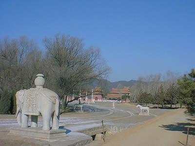 孝陵神路長(zhǎng)約6公里,南起金星山下的石牌坊,北到昌瑞山下的寶城、室頂,沿朝山、案山、靠山的三山連線,將孝陵的數(shù)十座建筑相貫串,形成陵區(qū)建筑中軸線。孝陵神路是清陵中最長(zhǎng)的神路。