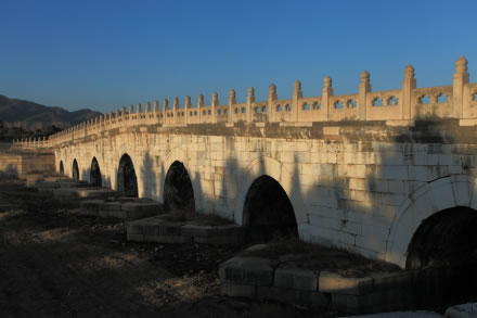 拱形橋在石橋中是等級(jí)最高的一種。七孔拱橋在清東陵只孝陵有一座。橋長(zhǎng)110米,兩側(cè)安設(shè)石欄板126塊,石望柱128根,抱鼓石4塊。