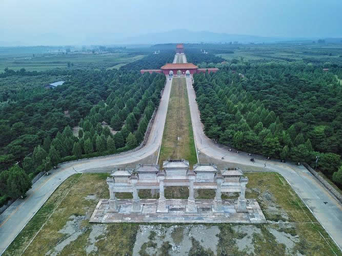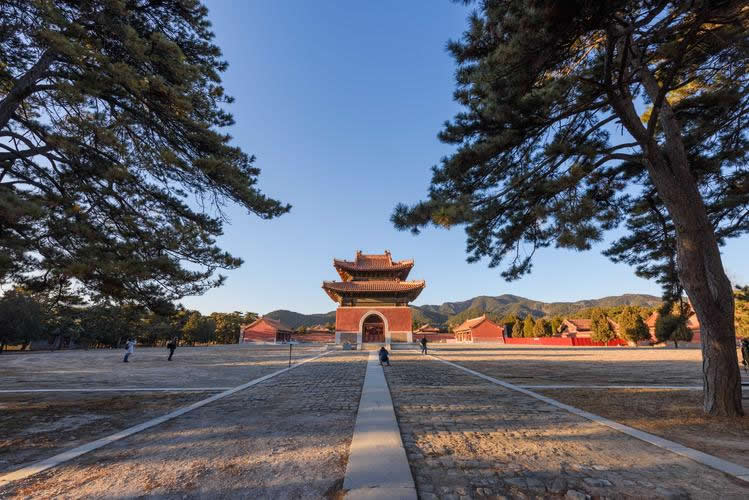 入關(guān)第一帝世祖順治皇帝的孝陵位于南起金星山,北達(dá)昌瑞山主峰的中軸線上,其余皇帝陵寢則以孝陵為中軸線按照“居中為尊”、“長(zhǎng)幼有序”、“尊卑有別”的傳統(tǒng)觀念依山勢(shì)在孝陵的兩側(cè)呈扇形東西排列開(kāi)來(lái)。各陵按規(guī)制營(yíng)建了一系列建筑,總體布局為"前朝后寢"!鞍俪邽樾,千尺為勢(shì)”的審美思想貫穿于每一座陵寢建筑中。