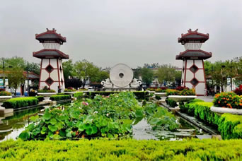 即趙苑的北大門,為一組仿秦漢風格的建筑,兩側(cè)是門闕。中間雕塑造型為當時名揚列國的趙國名寶“和氏璧”。據(jù)史書記載,此玉放在暗處自然有光,不沾灰塵,能避邪,放在身邊,冬暖夏涼,百步之內(nèi),蚊蠅不人,有諸多神異之處,難怪秦王愿以十五座城池來換它,可想它的神奇和價值。和氏璧上面的八個篆字“受命于天,既壽永昌”。相傳是秦朝丞相李斯所書。整個大門莊重典雅,氣勢恢宏。