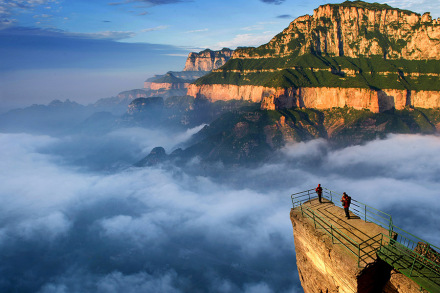 云峰畫廊是一條畫廊式的風(fēng)光帶,位于老爺頂?shù)陌肷窖,由清峰關(guān)起,環(huán)周8千米,終點又回到清峰關(guān)。它依附老爺頂,連接豫晉關(guān),遙望十字嶺,擷取太行山的精華,依山順勢建造了7個位置極佳的觀景臺,依次為聽禪臺、試膽臺、如畫臺、戲龍臺、丹鳳臺和歸真臺。