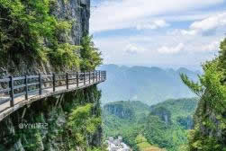 絕壁長廊,又叫“絕壁棧道”,始建于2007年10月,全長488米,118個臺階。位于海拔1700余米、凈高差300余米之絕壁山腰間。該工程既汲取了巴蜀古棧道營造法,又結合現代鋼筋砼施工之先進工藝,科學安全,凝聚著當代開發(fā)創(chuàng)業(yè)者的勇氣與智慧。沿棧道游覽,一路可以欣賞武陵風光。該棧道共有七道彎八道拐,寓意是:路七彎八拐,心始終如一。歌曰:北斗七星有七斗(dǒu),絕壁棧道有七抖(dǒu);經過一番驚嚇后,人生道路手拉手。