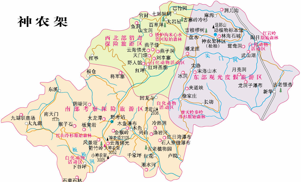 神農(nóng)架是位于湖北省西部一片群峰聳立的高大山地,橫亙于長江、漢水之間,方圓3250平方公里,相傳因上古的神農(nóng)氏在此搭架上山采藥而得名。景區(qū)山峰均在海拔3010米以上,堪稱“華中屋脊”。是以秀綠的亞高山自然風光,多樣的動植物種,人與自然和諧共存為主題的森林生態(tài)旅游區(qū)! 神農(nóng)架主要景點有神農(nóng)頂、風景埡、板壁巖、瞭望塔、小龍?zhí)丁⒋簖執(zhí)、金猴嶺等,以原始、神秘聞名于世,區(qū)內(nèi)山高谷深,林木茂密,氣候復雜多變,四季景色迷人。獨特的自然環(huán)境、人文歷史,造就了極其豐富、珍貴的自然和人文景觀,也孕育了景色宜人、鐘靈毓秀的旅游環(huán)境,有“神農(nóng)天園”之稱。