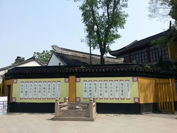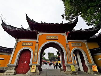寒山寺殿宇大多為清代建筑,主要有大雄寶殿、藏經(jīng)樓、鐘樓、碑廊、楓江樓、霜鐘閣等。寒山寺的建筑布局沒(méi)有嚴(yán)格的中軸線。寒山寺山門前面的石拱圈古橋是江村橋,橋堍與山門之間那垛黃墻稱照壁。山門兩旁兩棵古樟。黃墻內(nèi)古典樓閣飛檐翹角,右為楓江樓,左為霜鐘樓,都源于楓橋夜泊詩(shī)。佛龕背后一尊威風(fēng)凜凜的將軍像,面朝里,對(duì)著大雄寶殿,手拿金剛杵,也叫降魔杵,那是韋馱,位居四大天王手下的三十二神將之首。