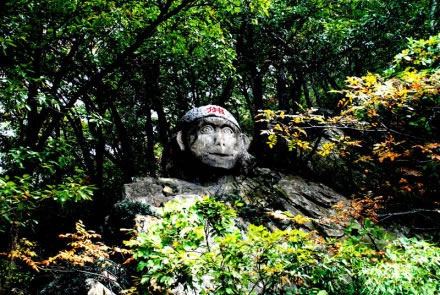 大圣佛是在自然石的基礎(chǔ)上,鑿刻而成的孫大圣頭像,供孫大圣的信仰者祭祀。孫悟空保護唐僧西天取回真經(jīng),功德圓滿,被如來封為斗戰(zhàn)勝佛,地位已遠遠高于觀音菩薩。斗戰(zhàn)勝佛,顧名思義是好斗善斗,而且是凡斗必勝。在人們心目中,孫悟空就是正義的象征,智慧的象征。每年臺灣地區(qū)和東南亞各國,都有很多進香團到花果山來朝拜孫大圣。