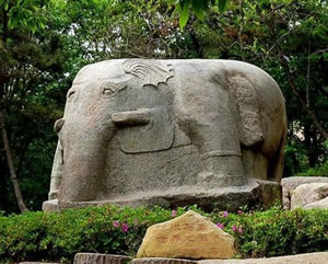 從龍洞西行,在林木掩映的山坡上.屹立著一座碩大的漢代圓雕石象。石象依一塊花崗巖巨石的自然形狀雕刻而成雕刻而成,象身高2.6米,長4.8米,背寬3.5米,石像耳闊體肥,四肢健壯,長鼻巨牙、卷尾粗足,形態(tài)雄奇,豐滿肥碩。象身西側(cè)有一高0.88米,寬0.49米,深0.2厘米的陰鑿凹面,系未見刻銘的題榜,象身東側(cè)以陰線刻一高1.13米,寬0.62米的方框,內(nèi)刻隸書“象石”字樣,在刻銘與象前腿之間,還鑿刻了一個(gè)頭梳“丁”字形發(fā)髻,手持勾鞭,腳帶鐐銬高0.92米的馴象奴。象的四足均踏著蓮花,體現(xiàn)了佛教中六牙白象王在水中步步蓮花的故事傳說。它是孔望山漢代佛教造像有機(jī)整體中不可分割的一部分。此石系目前我國發(fā)現(xiàn)的東漢時(shí)期最大的圓雕石刻,石象南側(cè)約一百五十米處,還有與此同時(shí)期的石雕鎮(zhèn)海蛙,此蛙為當(dāng)時(shí)鎮(zhèn)海之物。體長240厘米,寬220厘米,通高110厘米,石蛙頭部略損,前兩肢半殘,眼睛陰刻,背上遍刻陰線鱗紋。這兩座石雕,別特是石象,氣勢(shì)雄偉,造型精美。均為我國珍貴的石刻藝術(shù)珍品。