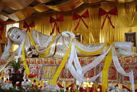 釋迦牟尼涅槃像由名貴的緬甸白玉精雕細琢而成。白玉毛料1999年在緬甸發(fā)現(xiàn),歷經三年艱苦開采,始現(xiàn)于世。玉料為一塊完整一體的純天然玉料。據(jù)玉材的天然造型,經過精心設計,由德純藝高的工匠歷兩年時間精工雕成。佛像長8.9米,高2.45米,總寬1.35米,體型比例均確。玉佛全身鑲嵌有1500多粒紅、藍、紫晶寶石和翡翠,衣紋和蓮花臺由24K黃金鎦金而成,彩繪部分采用天然石色彩畫而成。