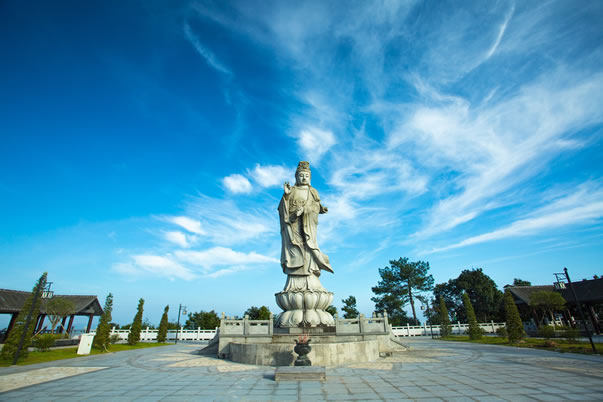 滴水觀音菩薩雕像于2007年香港回歸10周年贛粵港信眾捐建,其寶相慈祥莊嚴,左手持凈瓶,右手做法印,屹立在三百山東江的源頭。雕像總高11.69米,與主峰海拔相稱。雕像的形態(tài)、手法符合佛教的意義,具備當今美學、建筑學、雕塑學、佛像藝術(shù)的時代特色。