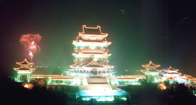 由一級高臺拾級而上,即達二級高臺(象征城墻的臺座)。這兩級高臺共有89級臺階,而新閣恰于1989年落成開放。二級高臺的墻體及地坪,均為江西峽江縣所產(chǎn)花崗石。高臺的四周,為按宋代式樣打鑿而成的花崗石欄桿,古樸厚重,與瑰麗的主閣形成鮮明的對比。