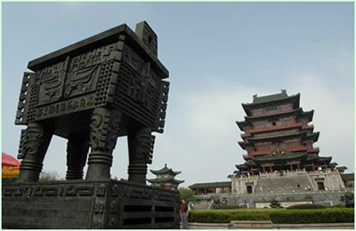 下部為三足古鼎,上部是一座攢尖寶頂圓亭式鼎蓋。此鼎乃仿北京大鐘寺“八怪”鼎而造。此鼎之設,寓有金石永固之意。