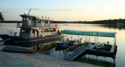 凈月潭水上游覽船舶集水上交通運(yùn)輸、游覽于一體。從任何一處碼頭上船都可以通向風(fēng)景區(qū)的幾個(gè)主要景點(diǎn):大壩碼頭、沙灘浴場(chǎng)碼頭、橡樹灣碼頭(森林浴場(chǎng))、滑雪場(chǎng)。凈月潭現(xiàn)有兩艘主要船舶。其中“乘風(fēng)號(hào)”游船系雙層雙體燃?xì)猸h(huán)保型游覽船舶,定員 100位。游客可在乘坐游船的同時(shí)觀賞凈月潭水的秀色。而“麒龍?zhí)枴笔且凰椰F(xiàn)代船舶,客艙內(nèi)配有電視、音樂,為游客播放凈月潭相關(guān)視頻,二層甲板處更是觀光遠(yuǎn)眺凈月風(fēng)景的好地方。凈月潭又從日本購(gòu)進(jìn)多輛三座位的“水上摩托艇”,速度快、較刺激,可供游客自行駕駛。由“摩托艇”牽引,游人還可踩滑水板滑翔于潭面。由“快艇”牽引,乘坐五座位的火箭沖浪艇,也極具刺激性。