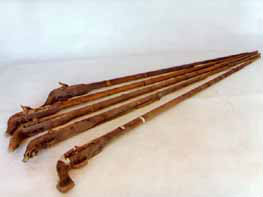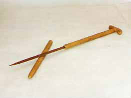 拐杖刀:俗稱(chēng)“二人奪”,長(zhǎng)約90厘米。表面上看呈拐杖型,木質(zhì)。但實(shí)際上,其前面是可以斷開(kāi)的,拔出外鞘,里面是一個(gè)刺刀。這是抗日斗爭(zhēng)初期,東滿(mǎn)游擊隊(duì)和當(dāng)?shù)厝罕娪脕?lái)對(duì)付敵人的秘密武器。是當(dāng)時(shí)很流行很實(shí)用的武器。