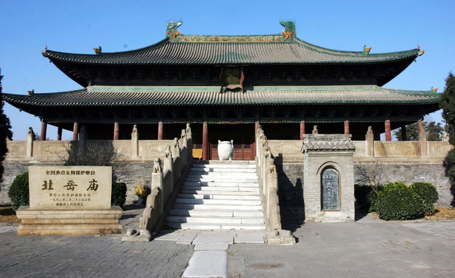 北岳廟,漢稱北岳祠,唐稱北岳安天王廟,宋稱北岳安天元圣帝廟,元稱北岳安天大貞元圣帝廟,到明時(shí)去掉歷代所加封號(hào),改稱為北岳廟,坐落在河北省保定市曲陽縣城西部恒州鎮(zhèn)北岳路2號(hào),始建于南北朝時(shí)期北魏景明、正始年間(500—512年),清順治十七年(1660年)以前,北岳廟一直是歷代封建帝王祭祀北岳恒山之神的場所,總占地面積為173982平方米。北岳廟建筑格局呈坐北朝南的“田”字形,采用的是以中軸線為主,兩廂對稱的傳統(tǒng)建筑形式。廟內(nèi)主體建筑德寧之殿在中軸線北端,往南依次建有飛石殿、三山門、凌霄門、御香亭、朝岳門、牌坊、石橋等。北岳廟是一座內(nèi)涵豐厚的文化藝術(shù)殿堂,集古建、繪畫、書法、石雕、定瓷等藝術(shù)于一身。北岳廟碑刻對研究所處時(shí)代的政治、經(jīng)濟(jì)、文化以及書法藝術(shù)的演變,提供了珍貴的實(shí)物資料。