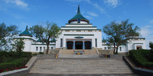 成吉思汗廟坐落在興安盟烏蘭浩特市罕山之巔,始建成于1940年,這座融漢、蒙、藏三個(gè)民族建筑風(fēng)格于一體的廟宇,從正面看是"山"字形。正殿當(dāng)中有16根粗大的紅漆明柱,四周繪有反映成吉思汗業(yè)績的精美圖案,中央為2.8米高的成吉思汗銅像;兩偏殿陳列有元代的兵器,服裝,瓷器等復(fù)制品,山門到正殿有寬10米、長158米用花崗巖砌成的81級臺階。成吉思汗廟融蒙、漢 、藏三個(gè)民族的建筑風(fēng)格于一體, 采取古代漢族建筑中慣用的中軸對稱布局手法,建筑主體圓頂方身,綠帽白墻,具有典型的蒙、藏建筑特色。