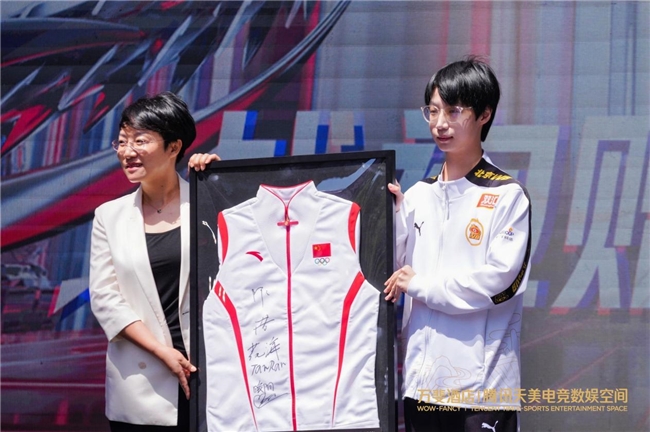 開業(yè)現(xiàn)場(chǎng)還舉辦了隆重的授牌儀式。由杭州第19屆亞運(yùn)會(huì)電子競技王者榮耀亞運(yùn)版本冠軍選手林恒,上臺(tái)將由6位亞運(yùn)冠軍簽名的戰(zhàn)袍贈(zèng)予了萬斐酒店騰訊天美電競數(shù)娛空間項(xiàng)目。