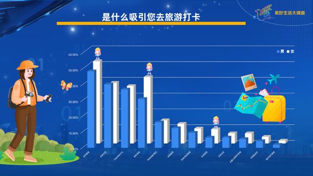 《美好生活大調(diào)查》發(fā)現(xiàn),自然景觀(guān)是吸引大家去旅游打卡的最主要因素,有將近一半的人會(huì)因此選擇旅游目的地。名勝古跡、歷史民俗文化和特色美食緊隨其后。不同人群中,女性對(duì)城市的特色美食超級(jí)偏愛(ài),因?yàn)樘厣朗橙ヒ粋(gè)城市旅游的女性占比高出男性11個(gè)百分點(diǎn)以上。跟女性相比,男性對(duì)名勝古跡和特色民宿/酒店更感興趣一點(diǎn)。