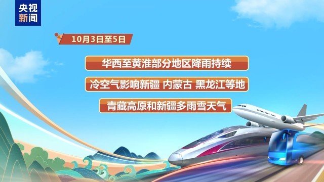 據(jù)中央氣象臺(tái)發(fā)布的消息,10月3日至5日,華西至黃淮一帶部分地區(qū)降雨持續(xù),冷空氣影響我國(guó)新疆、內(nèi)蒙古、黑龍江等地,青藏高原和新疆多雨雪天氣。公安部交通管理局提醒廣大駕駛?cè)撕统鲂腥罕姡⒁怅P(guān)注沿途及目的地氣象部門預(yù)報(bào)預(yù)警信息。
