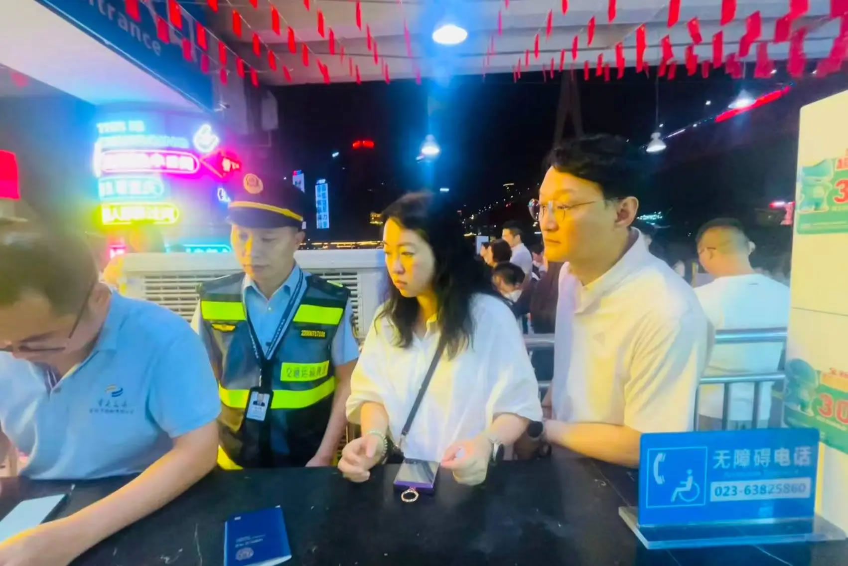 10月5日晚,兩名韓國游客因手機(jī)損壞無法出示購票信息,向洪崖洞客運(yùn)碼頭兩江游執(zhí)法服務(wù)站求助。執(zhí)法人員一邊安撫游客,一邊協(xié)調(diào)技術(shù)人員通過后臺系統(tǒng)查詢,不到5分鐘便幫助游客順利登船。這一高效處置展現(xiàn)了服務(wù)站“事企聯(lián)動”機(jī)制的優(yōu)勢,也為外國游客留下了美好的重慶印象。