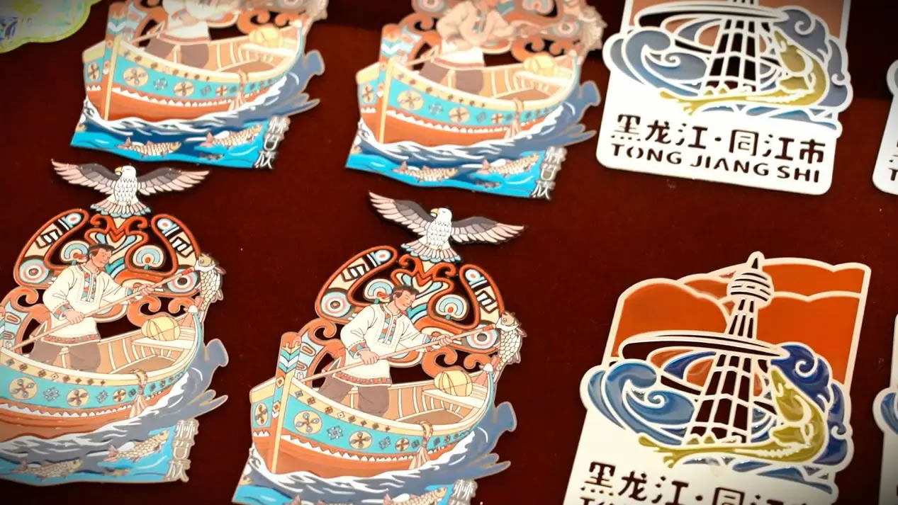 除了魚皮手工藝品,印著同江特色風(fēng)景的冰箱貼、書簽、水杯等文創(chuàng)產(chǎn)品也成了游客們的心頭好,在各大景區(qū)的文創(chuàng)商店里時常被搶購一空。